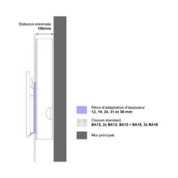 Seuls 10 cm « utiles » dans la cloison sont nécessaires; la modularité de conception permet l’adaptation à des épaisseurs de cloisons standards allant de 12 à 38 mm.